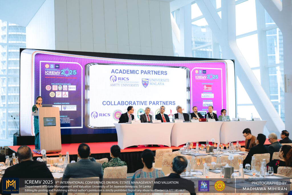 The Department of Estate Management and Valuation proudly hosted the 9th International Conference on Real Estate Management and Valuation (ICREMV 2025) on 23rd and 24th October 2025 at the University of Sri Jayewardenepura and City of Dreams, Cinnamon Life, Colombo.This year’s conference brought together scholars, industry experts, policymakers, and students through a dynamic series of events, including Pre-Conference Workshops, the Inauguration Ceremony, Academic Sessions, and the Policy Talk Series, all aimed at shaping the future of real estate and valuation.