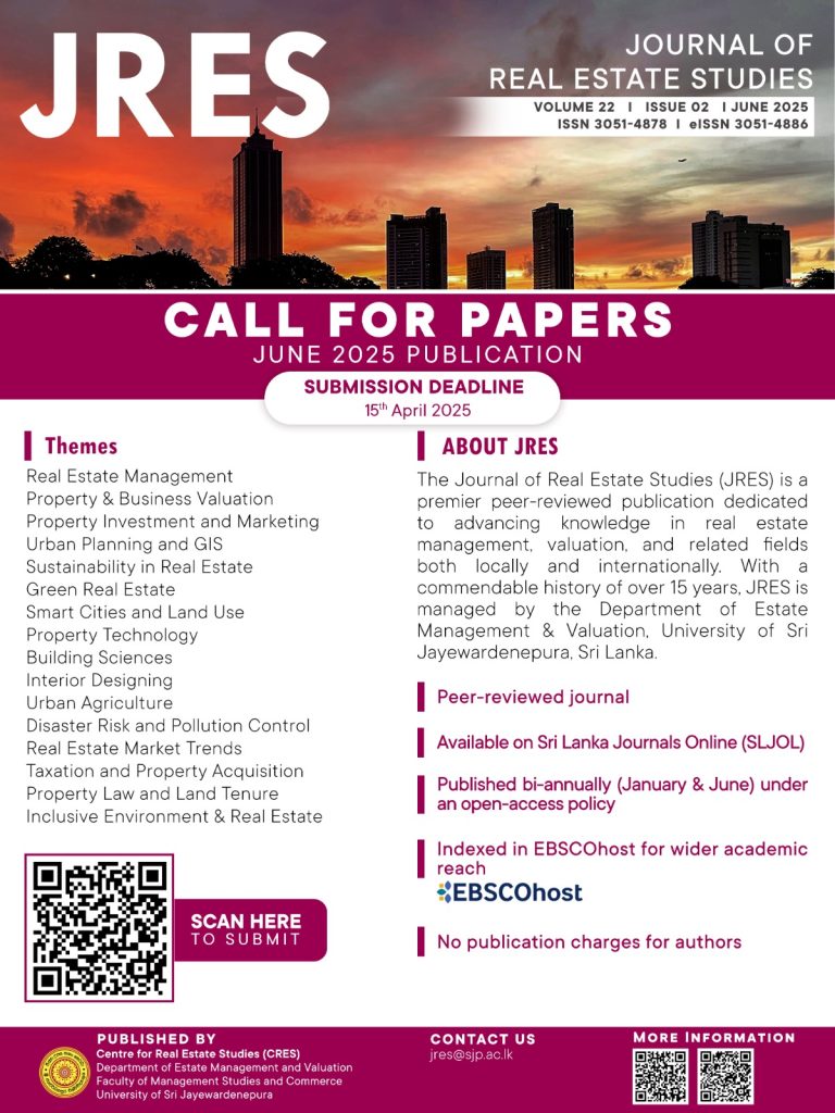 The Journal of Real Estate Studies (JRES), a peer-reviewed and open-access publication managed by the Department of Estate Management & Valuation, University of Sri Jayewardenepura, invites original research papers for its upcoming June 2025 issue (Vol. 22, Issue 02).
